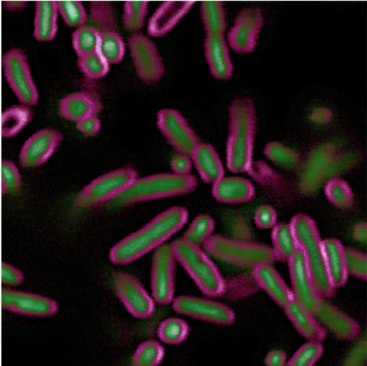 E. coli stained with BactoView™ Live Green (stains DNA) and SynaptoRed™ (stains the membrane)